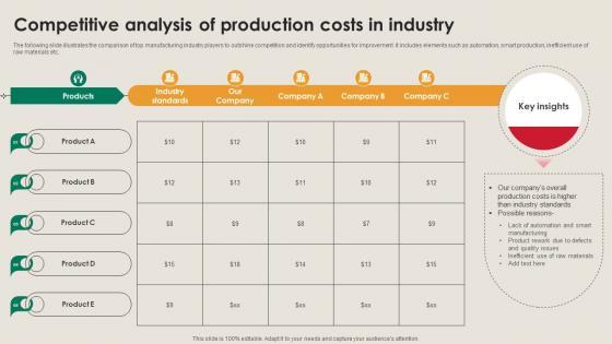 The following slide illustrates the comparison of top manufacturing industry players to outshine competition and identify opportunities for improvement. It includes elements such as automation, smart production, inefficient use of raw materials etc. Whether you have daily or monthly meetings, a brilliant presentation is necessary. Competitive Analysis Of Production Costs Manufacturing Strategy Driving Industry 4 0 can be your best option for delivering a presentation. Represent everything in detail using Competitive Analysis Of Production Costs Manufacturing Strategy Driving Industry 4 0 and make yourself stand out in meetings. The template is versatile and follows a structure that will cater to your requirements. All the templates prepared by Slidegeeks are easy to download and edit. Our research experts have taken care of the corporate themes as well. So, give it a try and see the results. The following slide illustrates the comparison of top manufacturing industry players to outshine competition and identify opportunities for improvement. It includes elements such as automation, smart production, inefficient use of raw materials etc.