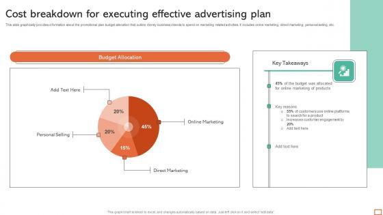 This slide graphically provides information about the promotional plan budget allocation that outline money business intends to spend on marketing related activities. It includes online marketing, direct marketing, personal selling, etc. Pitch your topic with ease and precision using this Cost Breakdown For Executing Effective Advertising Plan Diagrams Pdf. This layout presents information on Online Marketing, Budget Allocation. It is also available for immediate download and adjustment. So, changes can be made in the color, design, graphics or any other component to create a unique layout. This slide graphically provides information about the promotional plan budget allocation that outline money business intends to spend on marketing related activities. It includes online marketing, direct marketing, personal selling, etc.