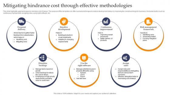 This slide highlights agile techniques to minimize cost of delays. The purpose of this template is to offer business techniques to reduce development delays by improving the overall workings for business. It includes tactics such as continuous improvement, assigning roles, using right software, etc. Pitch your topic with ease and precision using this Mitigating Hindrance Cost Through Effective Methodologies Clipart pdf. This layout presents information on Continuous Improvement, Assigning Roles, Using Right Software. It is also available for immediate download and adjustment. So, changes can be made in the color, design, graphics or any other component to create a unique layout. This slide highlights agile techniques to minimize cost of delays. The purpose of this template is to offer business techniques to reduce development delays by improving the overall workings for business. It includes tactics such as continuous improvement, assigning roles, using right software, etc.