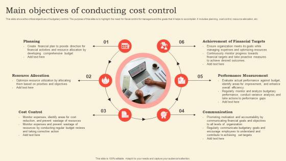 This slide shows the critical objectives of budgetary control. The purpose of this slide is to highlight the need for fiscal control for managers and the goals that it helps to accomplish. It includes planning, cost control, resource allocation, etc. Showcasing this set of slides titled Main Objectives Of Conducting Cost Control Sample Pdf. The topics addressed in these templates are Planning, Resource Allocation, Cost Control. All the content presented in this PPT design is completely editable. Download it and make adjustments in color, background, font etc. as per your unique business setting. This slide shows the critical objectives of budgetary control. The purpose of this slide is to highlight the need for fiscal control for managers and the goals that it helps to accomplish. It includes planning, cost control, resource allocation, etc.