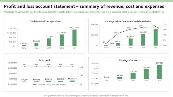 The slides provide a glimpse of the projected profit and loss statement to visualize the platforms financial performance for the next five years. The key components are total revenue from operations, gross profit, EBITDA, etc. Create an editable Profit And Loss Account Statement Summary Of Revenue Cost And Expenses Introduction PDF that communicates your idea and engages your audience. Whether you are presenting a business or an educational presentation, pre-designed presentation templates help save time. Profit And Loss Account Statement Summary Of Revenue Cost And Expenses Introduction PDF is highly customizable and very easy to edit, covering many different styles from creative to business presentations. Slidegeeks has creative team members who have crafted amazing templates. So, go and get them without any delay.