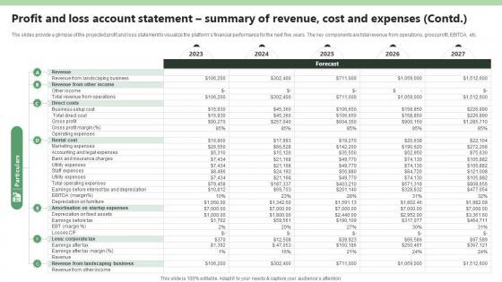 The slides provide a glimpse of the projected profit and loss statement to visualize the platforms financial performance for the next five years. The key components are total revenue from operations, gross profit, EBITDA, etc. The Profit And Loss Account Statement Summary Of Revenue Cost Lawn Care BP SS V is a compilation of the most recent design trends as a series of slides. It is suitable for any subject or industry presentation, containing attractive visuals and photo spots for businesses to clearly express their messages. This template contains a variety of slides for the user to input data, such as structures to contrast two elements, bullet points, and slides for written information. Slidegeeks is prepared to create an impression. The slides provide a glimpse of the projected profit and loss statement to visualize the platforms financial performance for the next five years. The key components are total revenue from operations, gross profit, EBITDA, etc.