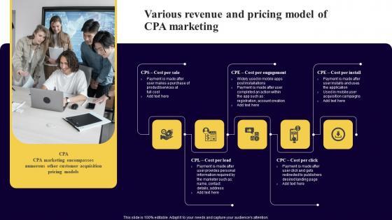 Slidegeeks has constructed Various Revenue And Pricing Model Of CPA Executing Cost Per Action Marketing Infographics Pdf after conducting extensive research and examination. These presentation templates are constantly being generated and modified based on user preferences and critiques from editors. Here, you will find the most attractive templates for a range of purposes while taking into account ratings and remarks from users regarding the content. This is an excellent jumping-off point to explore our content and will give new users an insight into our top-notch PowerPoint Templates. Our Various Revenue And Pricing Model Of CPA Executing Cost Per Action Marketing Infographics Pdf are topically designed to provide an attractive backdrop to any subject. Use them to look like a presentation pro.