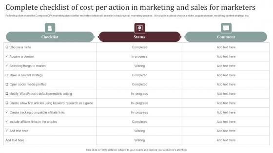 Following slide shows the Complete CPA marketing check list for marketers which will assist in to track overall marketing process . It includes such as choose a niche, acquire domain, modifying content strategy, etc. Showcasing this set of slides titled Complete Checklist Of Cost Per Action In Marketing And Sales For Marketers Ideas Pdf. The topics addressed in these templates are Checklist, Status, Comment. All the content presented in this PPT design is completely editable. Download it and make adjustments in color, background, font etc. as per your unique business setting. Following slide shows the Complete CPA marketing check list for marketers which will assist in to track overall marketing process . It includes such as choose a niche, acquire domain, modifying content strategy, etc.