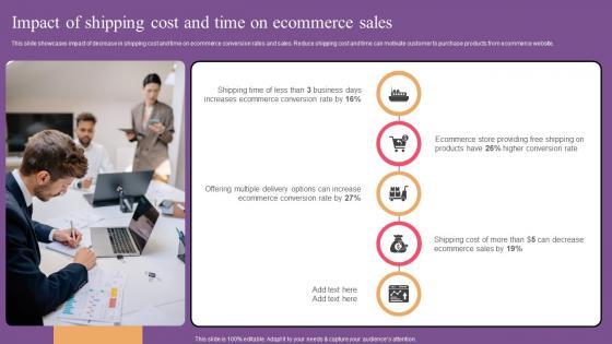 This slide showcases impact of decrease in shipping cost and time on ecommerce conversion rates and sales. Reduce shipping cost and time can motivate customer to purchase products from ecommerce website. Present like a pro with Impact Of Shipping Cost And Time On Ecommerce Sales Template PDF Create beautiful presentations together with your team, using our easy to use presentation slides. Share your ideas in real time and make changes on the fly by downloading our templates. So whether you are in the office, on the go, or in a remote location, you can stay in sync with your team and present your ideas with confidence. With Slidegeeks presentation got a whole lot easier. Grab these presentations today.