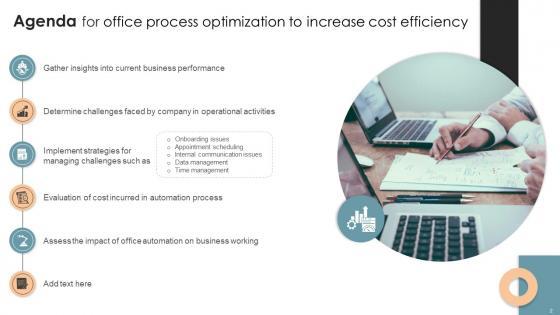 Boost your pitch with our creative Agenda For Office Process Optimization To Increase Cost Efficiency. Deliver an awe-inspiring pitch that will mesmerize everyone. Using these presentation templates you will surely catch everyones attention. You can browse the ppts collection on our website. We have researchers who are experts at creating the right content for the templates. So you do not have to invest time in any additional work. Just grab the template now and use them. Our Agenda For Office Process Optimization To Increase Cost Efficiency are topically designed to provide an attractive backdrop to any subject. Use them to look like a presentation pro.