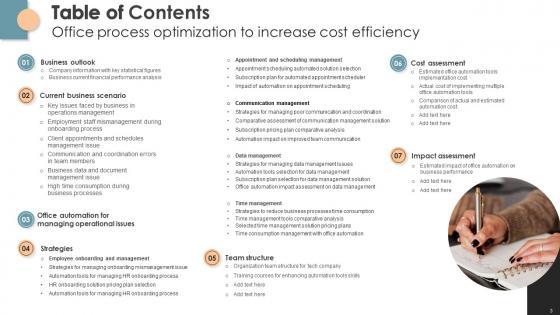 Explore a selection of the finest Office Process Optimization To Increase Cost Efficiency Table Of Contents here. With a plethora of professionally designed and pre-made slide templates, you can quickly and easily find the right one for your upcoming presentation. You can use our Office Process Optimization To Increase Cost Efficiency Table Of Contents to effectively convey your message to a wider audience. Slidegeeks has done a lot of research before preparing these presentation templates. The content can be personalized and the slides are highly editable. Grab templates today from Slidegeeks. Our Office Process Optimization To Increase Cost Efficiency Table Of Contents are topically designed to provide an attractive backdrop to any subject. Use them to look like a presentation pro.