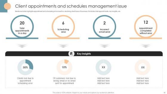 Mentioned slide highlights appointment and scheduling errors lead to a declining client base of business. It includes total appointments, key insights, etc.From laying roadmaps to briefing everything in detail, our templates are perfect for you. You can set the stage with your presentation slides. All you have to do is download these easy-to-edit and customizable templates. Client Appointments And Schedules Management Issue Office Process Optimization To Increase Cost Efficiency will help you deliver an outstanding performance that everyone would remember and praise you for. Do download this presentation today. Mentioned slide highlights appointment and scheduling errors lead to a declining client base of business. It includes total appointments, key insights, etc.