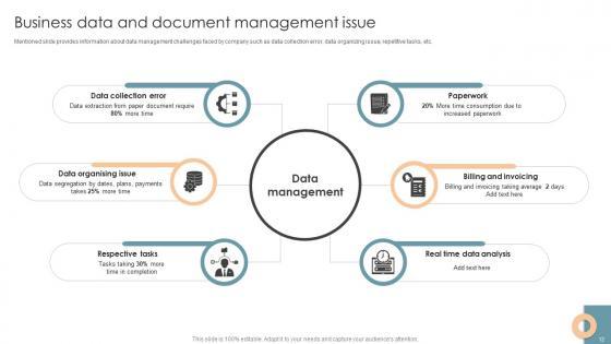 Mentioned slide provides information about data management challenges faced by company such as data collection error, data organizing issue, repetitive tasks, etc.Get a simple yet stunning designed Business Data And Document Management Issue Office Process Optimization To Increase Cost Efficiency. It is the best one to establish the tone in your meetings. It is an excellent way to make your presentations highly effective. So, download this PPT today from Slidegeeks and see the positive impacts. Our easy-to-edit Business Data And Document Management Issue Office Process Optimization To Increase Cost Efficiency can be your go-to option for all upcoming conferences and meetings. So, what are you waiting for Grab this template today. Mentioned slide provides information about data management challenges faced by company such as data collection error, data organizing issue, repetitive tasks, etc.