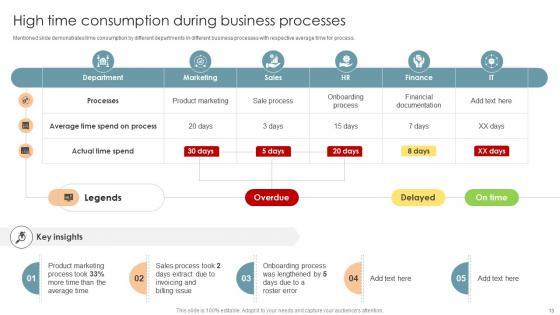 Mentioned slide demonstrates time consumption by different departments in different business processes with respective average time for process.Are you in need of a template that can accommodate all of your creative concepts This one is crafted professionally and can be altered to fit any style. Use it with Google Slides or PowerPoint. Include striking photographs, symbols, depictions, and other visuals. Fill, move around, or remove text boxes as desired. Test out color palettes and font mixtures. Edit and save your work, or work with colleagues. Download High Time Consumption During Business Processes Office Process Optimization To Increase Cost Efficiency and observe how to make your presentation outstanding. Give an impeccable presentation to your group and make your presentation unforgettable. Mentioned slide demonstrates time consumption by different departments in different business processes with respective average time for process.