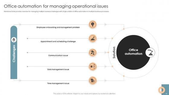 Mentioned slide provides overview for managing multiple business challenges with single solution of office automation in multiple business processes.This modern and well-arranged Office Automation For Managing Operational Issues Office Process Optimization To Increase Cost Efficiency provides lots of creative possibilities. It is very simple to customize and edit with the Powerpoint Software. Just drag and drop your pictures into the shapes. All facets of this template can be edited with Powerpoint, no extra software is necessary. Add your own material, put your images in the places assigned for them, adjust the colors, and then you can show your slides to the world, with an animated slide included. Mentioned slide provides overview for managing multiple business challenges with single solution of office automation in multiple business processes.