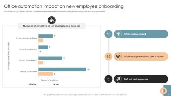 Mentioned slide highlights the impact of automation solution implementation on the onboarding process leading to declined employee turnover.Welcome to our selection of the Office Automation Impact On New Employee Office Process Optimization To Increase Cost Efficiency. These are designed to help you showcase your creativity and bring your sphere to life. Planning and Innovation are essential for any business that is just starting out. This collection contains the designs that you need for your everyday presentations. All of our PowerPoints are 100 percent editable, so you can customize them to suit your needs. This multi-purpose template can be used in various situations. Grab these presentation templates today. Mentioned slide highlights the impact of automation solution implementation on the onboarding process leading to declined employee turnover.
