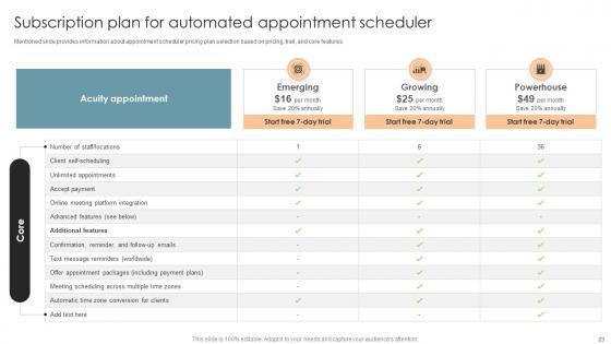 Following slide demonstrates comparative assessment of appointment and scheduling tools selection based on criteria such as subscription plan, automated email, etc.Create an editable Appointment Scheduling Automated Solution Selection Office Process Optimization To Increase Cost Efficiency that communicates your idea and engages your audience. Whether you are presenting a business or an educational presentation, pre-designed presentation templates help save time. Appointment Scheduling Automated Solution Selection Office Process Optimization To Increase Cost Efficiency is highly customizable and very easy to edit, covering many different styles from creative to business presentations. Slidegeeks has creative team members who have crafted amazing templates. So, go and get them without any delay. Following slide demonstrates comparative assessment of appointment and scheduling tools selection based on criteria such as subscription plan, automated email, etc.