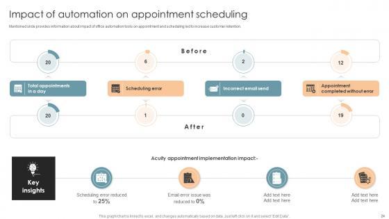 Mentioned slide provides information about impact of office automation tools on appointment and scheduling led to increase customer retention.Formulating a presentation can take up a lot of effort and time, so the content and message should always be the primary focus. The visuals of the PowerPoint can enhance the presenters message, so our Impact Of Automation On Appointment Scheduling Office Process Optimization To Increase Cost Efficiency was created to help save time. Instead of worrying about the design, the presenter can concentrate on the message while our designers work on creating the ideal templates for whatever situation is needed. Slidegeeks has experts for everything from amazing designs to valuable content, we have put everything into Impact Of Automation On Appointment Scheduling Office Process Optimization To Increase Cost Efficiency. Mentioned slide provides information about impact of office automation tools on appointment and scheduling led to increase customer retention.