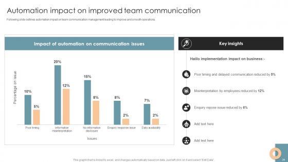 Following slide outlines automation impact on team communication management leading to improve and smooth operations.Slidegeeks is one of the best resources for PowerPoint templates. You can download easily and regulate Automation Impact On Improved Team Communication Office Process Optimization To Increase Cost Efficiency for your personal presentations from our wonderful collection. A few clicks is all it takes to discover and get the most relevant and appropriate templates. Use our Templates to add a unique zing and appeal to your presentation and meetings. All the slides are easy to edit and you can use them even for advertisement purposes. Following slide outlines automation impact on team communication management leading to improve and smooth operations.