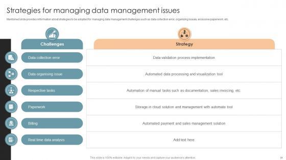 Mentioned slide provides information about strategies to be adopted for managing data management challenges such as data collection error, organizing issues, excessive paperwork, etc.Are you searching for a Strategies For Managing Data Management Issues Office Process Optimization To Increase Cost Efficiency that is uncluttered, straightforward, and original Its easy to edit, and you can change the colors to suit your personal or business branding. For a presentation that expresses how much effort you have put in, this template is ideal With all of its features, including tables, diagrams, statistics, and lists, its perfect for a business plan presentation. Make your ideas more appealing with these professional slides. Download Strategies For Managing Data Management Issues Office Process Optimization To Increase Cost Efficiency from Slidegeeks today. Mentioned slide provides information about strategies to be adopted for managing data management challenges such as data collection error, organizing issues, excessive paperwork, etc.