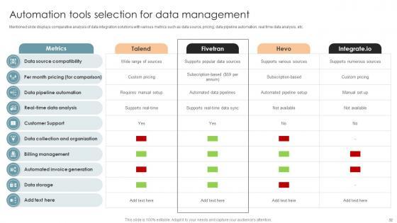 Mentioned slide displays comparative analysis of data integration solutions with various metrics such as data source, pricing, data pipeline automation, real time data analysis, etc.There are so many reasons you need a Automation Tools Selection For Data Management Office Process Optimization To Increase Cost Efficiency. The first reason is you can not spend time making everything from scratch, Thus, Slidegeeks has made presentation templates for you too. You can easily download these templates from our website easily. Mentioned slide displays comparative analysis of data integration solutions with various metrics such as data source, pricing, data pipeline automation, real time data analysis, etc.
