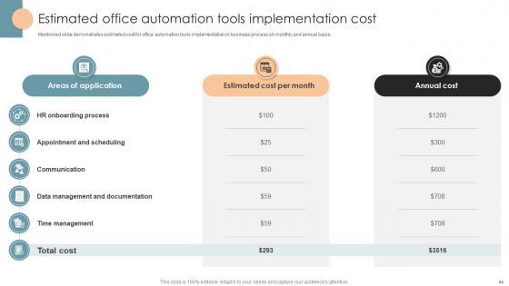 Mentioned slide demonstrates estimated cost for office automation tools implementation in business process on monthly and annual basis.If you are looking for a format to display your unique thoughts, then the professionally designed Estimated Office Automation Tools Implementation Cost Office Process Optimization To Increase Cost Efficiency is the one for you. You can use it as a Google Slides template or a PowerPoint template. Incorporate impressive visuals, symbols, images, and other charts. Modify or reorganize the text boxes as you desire. Experiment with shade schemes and font pairings. Alter, share or cooperate with other people on your work. Download Estimated Office Automation Tools Implementation Cost Office Process Optimization To Increase Cost Efficiency and find out how to give a successful presentation. Present a perfect display to your team and make your presentation unforgettable. Mentioned slide demonstrates estimated cost for office automation tools implementation in business process on monthly and annual basis.