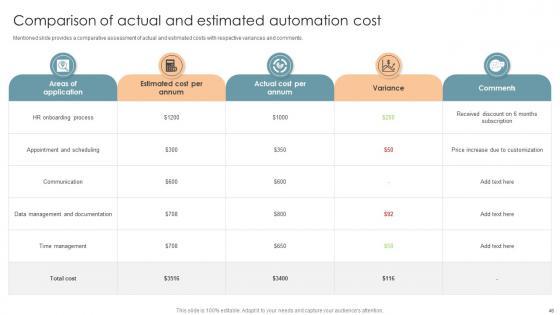 Mentioned slide provides a comparative assessment of actual and estimated costs with respective variances and comments.Whether you have daily or monthly meetings, a brilliant presentation is necessary. Comparison Of Actual And Estimated Automation Cost Office Process Optimization To Increase Cost Efficiency can be your best option for delivering a presentation. Represent everything in detail using Comparison Of Actual And Estimated Automation Cost Office Process Optimization To Increase Cost Efficiency and make yourself stand out in meetings. The template is versatile and follows a structure that will cater to your requirements. All the templates prepared by Slidegeeks are easy to download and edit. Our research experts have taken care of the corporate themes as well. So, give it a try and see the results. Mentioned slide provides a comparative assessment of actual and estimated costs with respective variances and comments.