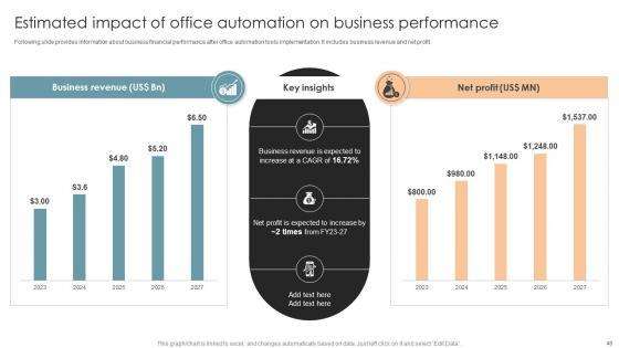 Following slide provides information about business financial performance after office automation tools implementation. It includes business revenue and net profit.If your project calls for a presentation, then Slidegeeks is your go-to partner because we have professionally designed, easy-to-edit templates that are perfect for any presentation. After downloading, you can easily edit Estimated Impact Of Office Automation On Business Office Process Optimization To Increase Cost Efficiency and make the changes accordingly. You can rearrange slides or fill them with different images. Check out all the handy templates Following slide provides information about business financial performance after office automation tools implementation. It includes business revenue and net profit.