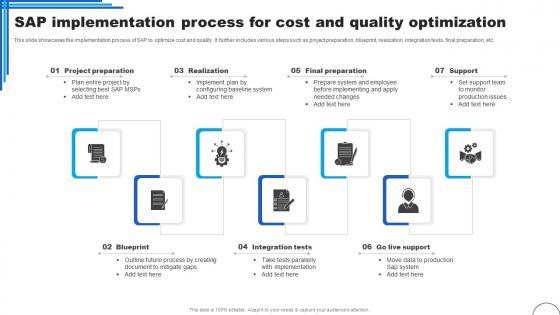 This slide showcases the implementation process of SAP to optimize cost and quality. It further includes various steps such as project preparation, blueprint, realization, integration tests, final preparation, etc. Showcasing this set of slides titled SAP Implementation Process For Cost And Quality Optimization Ppt Professional Slide Pdf. The topics addressed in these templates are Project Preparation, Blueprint, Realization. All the content presented in this PPT design is completely editable. Download it and make adjustments in color, background, font etc. as per your unique business setting. This slide showcases the implementation process of SAP to optimize cost and quality. It further includes various steps such as project preparation, blueprint, realization, integration tests, final preparation, etc.