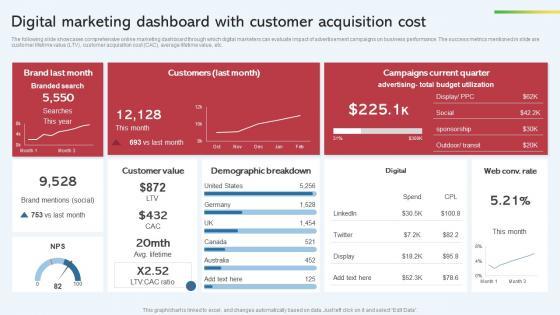 The following slide showcases comprehensive online marketing dashboard through which digital marketers can evaluate impact of advertisement campaigns on business performance. The success metrics mentioned in slide are customer lifetime value LTV, customer acquisition cost CAC, average lifetime value, etc. Slidegeeks is here to make your presentations a breeze with Digital Marketing Dashboard With Customer Acquisition Cost Effective Startup Promotion Plan Formats Pdf With our easy to use and customizable templates, you can focus on delivering your ideas rather than worrying about formatting. With a variety of designs to choose from, you are sure to find one that suits your needs. And with animations and unique photos, illustrations, and fonts, you can make your presentation pop. So whether you are giving a sales pitch or presenting to the board, make sure to check out Slidegeeks first. The following slide showcases comprehensive online marketing dashboard through which digital marketers can evaluate impact of advertisement campaigns on business performance. The success metrics mentioned in slide are customer lifetime value LTV, customer acquisition cost CAC, average lifetime value, etc.