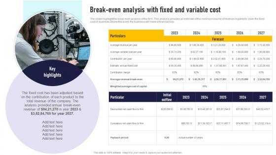 The slides highlight the break-even analysis of the firm. This analysis provides an estimate of the minimum volume of revenue required to cover the fixed cost of business. Below this point, the business will make a financial loss. Slidegeeks is one of the best resources for PowerPoint templates. You can download easily and regulate Break Even Analysis With Fixed And Variable Cost BPO Center Business Plan Guidelines Pdf for your personal presentations from our wonderful collection. A few clicks is all it takes to discover and get the most relevant and appropriate templates. Use our Templates to add a unique zing and appeal to your presentation and meetings. All the slides are easy to edit and you can use them even for advertisement purposes. The slides highlight the break-even analysis of the firm. This analysis provides an estimate of the minimum volume of revenue required to cover the fixed cost of business. Below this point, the business will make a financial loss.