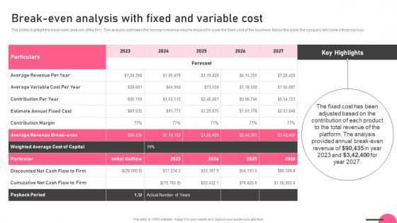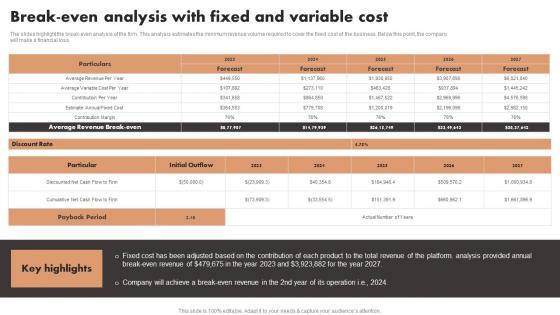 The slides highlight the break-even analysis of the firm. This analysis provides an estimate of the minimum volume of revenue required to cover the fixed cost of business. Below this point, the business will make a financial loss. Find a pre designed and impeccable Break Even Analysis With Fixed And Variable Cost Inspiration PDF. The templates can ace your presentation without additional effort. You can download these easy to edit presentation templates to make your presentation stand out from others. So, what are you waiting for Download the template from Slidegeeks today and give a unique touch to your presentation.