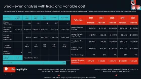 The slides highlight the break-even analysis of the firm. This analysis provides an estimate of the minimum volume of revenue required to cover the fixed cost of business. Below this point, the business will make a financial loss. Create an editable Creative Agency Business Plan Break Even Analysis With Fixed And Variable Cost BP SS V that communicates your idea and engages your audience. Whether you are presenting a business or an educational presentation, pre-designed presentation templates help save time. Creative Agency Business Plan Break Even Analysis With Fixed And Variable Cost BP SS V is highly customizable and very easy to edit, covering many different styles from creative to business presentations. Slidegeeks has creative team members who have crafted amazing templates. So, go and get them without any delay. The slides highlight the break-even analysis of the firm. This analysis provides an estimate of the minimum volume of revenue required to cover the fixed cost of business. Below this point, the business will make a financial loss.