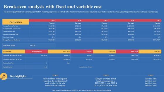 The slides highlight the break-even analysis of the firm. This analysis provides an estimate of the minimum volume of revenue required to cover the fixed cost of business. Below this point, the business will make a financial loss. Here you can discover an assortment of the finest PowerPoint and Google Slides templates. With these templates, you can create presentations for a variety of purposes while simultaneously providing your audience with an eye-catching visual experience. Download Break Even Analysis With Fixed And Variable Cost Summary PDF to deliver an impeccable presentation. These templates will make your job of preparing presentations much quicker, yet still, maintain a high level of quality. Slidegeeks has experienced researchers who prepare these templates and write high-quality content for you. Later on, you can personalize the content by editing the Break Even Analysis With Fixed And Variable Cost Summary PDF.