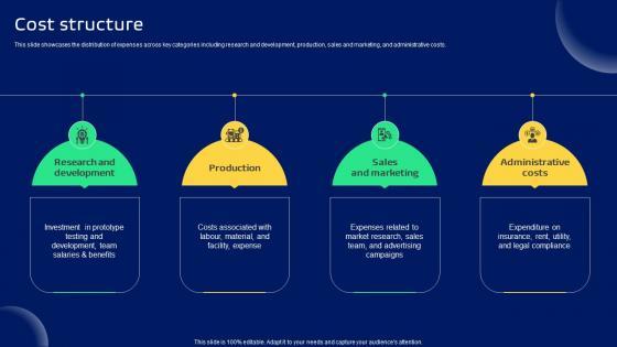 This slide showcases the distribution of expenses across key categories including research and development, production, sales and marketing, and administrative costs. Create an editable Cost Structure Smart Transportation Solutions Provider Business Model BMC SS V that communicates your idea and engages your audience. Whether you are presenting a business or an educational presentation, pre designed presentation templates help save time. Cost Structure Smart Transportation Solutions Provider Business Model BMC SS V is highly customizable and very easy to edit, covering many different styles from creative to business presentations. Slidegeeks has creative team members who have crafted amazing templates. So, go and get them without any delay. This slide showcases the distribution of expenses across key categories including research and development, production, sales and marketing, and administrative costs.