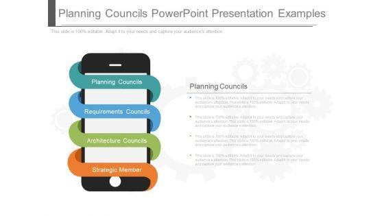 This is a planning councils powerpoint presentation examples. This is a four stage process. The stages in this process are planning councils, requirements councils, architecture councils, strategic member.