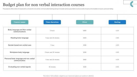 The purpose of this slide is to represent a cost plan for non verbal communication trainings along. It includes various parameters such as name of course, time duration of course, price and rating. Pitch your topic with ease and precision using this Budget Plan For Non Verbal Interaction Courses Ideas Pdf. This layout presents information on Budget Plan, Non Verbal Interaction, Time Duration Of Course, Price And Rating. It is also available for immediate download and adjustment. So, changes can be made in the color, design, graphics or any other component to create a unique layout. The purpose of this slide is to represent a cost plan for non verbal communication trainings along. It includes various parameters such as name of course, time duration of course, price and rating.