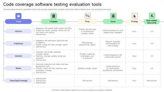 This slide outlines the he key capabilities of each code coverage analysis tools. It includes various tools with their features, pros, cons, pricing and user review. Showcasing this set of slides titled Code Coverage Software Testing Evaluation Tools Ppt Pictures Ideas Pdf. The topics addressed in these templates are Pros, Cons, Pricing, User Review. All the content presented in this PPT design is completely editable. Download it and make adjustments in color, background, font etc. as per your unique business setting. This slide outlines the he key capabilities of each code coverage analysis tools. It includes various tools with their features,pros,cons,pricing and user review.