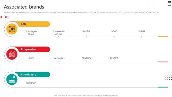 Mentioned slide provides insights into an associated brand with company. It includes brands by different categories such as Core, Progressive, and Sport Luxury. It includes core brands such as Skoda, Seat, Cupra, etc.Mentioned slide provides insights into an associated brand with company. It includes brands by different categories such as Core, Progressive, and Sport Luxury. It includes core brands such as Skoda, Seat, Cupra, etc.Find a pre-designed and impeccable Associated Brands Automobile Development Company Profile CP SS V. The templates can ace your presentation without additional effort. You can download these easy-to-edit presentation templates to make your presentation stand out from others. So, what are you waiting for Download the template from Slidegeeks today and give a unique touch to your presentation. Mentioned slide provides insights into an associated brand with company. It includes brands by different categories such as Core, Progressive, and Sport Luxury. It includes core brands such as Skoda, Seat, Cupra, etc.