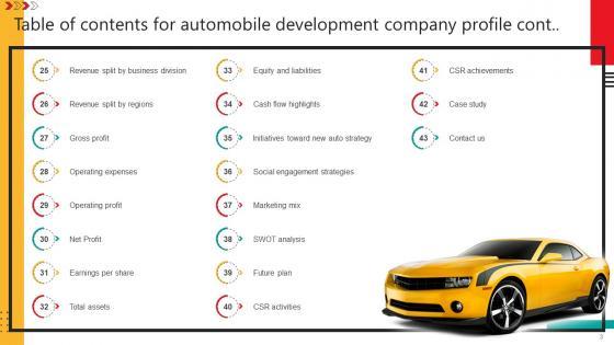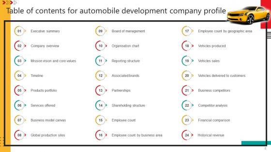 Get a simple yet stunning designed Table Of Contents For Automobile Development Company Profile CP SS V. It is the best one to establish the tone in your meetings. It is an excellent way to make your presentations highly effective. So, download this PPT today from Slidegeeks and see the positive impacts. Our easy-to-edit Table Of Contents For Automobile Development Company Profile CP SS V can be your go-to option for all upcoming conferences and meetings. So, what are you waiting for Grab this template today. Our Table Of Contents For Automobile Development Company Profile CP SS V are topically designed to provide an attractive backdrop to any subject. Use them to look like a presentation pro.