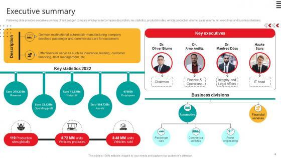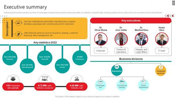 Following slide provides executive summary of Volkswagen company which present company description, key statistics, production sites, vehicle production volume, sales volume, key executives and business divisions.If you are looking for a format to display your unique thoughts, then the professionally designed Executive Summary Automobile Development Company Profile CP SS V is the one for you. You can use it as a Google Slides template or a PowerPoint template. Incorporate impressive visuals, symbols, images, and other charts. Modify or reorganize the text boxes as you desire. Experiment with shade schemes and font pairings. Alter, share or cooperate with other people on your work. Download Executive Summary Automobile Development Company Profile CP SS V and find out how to give a successful presentation. Present a perfect display to your team and make your presentation unforgettable. Following slide provides executive summary of Volkswagen company which present company description, key statistics, production sites, vehicle production volume, sales volume, key executives and business divisions.