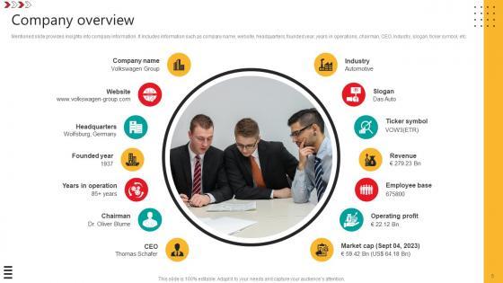 Mentioned slide provides insights into company information. It includes information such as company name, website, headquarters, founded year, years in operations, chairman, CEO, industry, slogan, ticker symbol, etc.Do you have to make sure that everyone on your team knows about any specific topic I yes, then you should give Company Overview Automobile Development Company Profile CP SS V a try. Our experts have put a lot of knowledge and effort into creating this impeccable Company Overview Automobile Development Company Profile CP SS V. You can use this template for your upcoming presentations, as the slides are perfect to represent even the tiniest detail. You can download these templates from the Slidegeeks website and these are easy to edit. So grab these today Mentioned slide provides insights into company information. It includes information such as company name, website, headquarters, founded year, years in operations, chairman, CEO, industry, slogan, ticker symbol, etc.