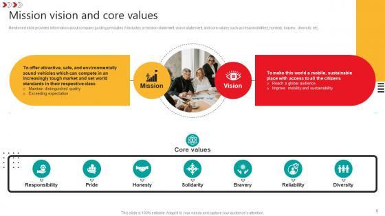 Mentioned slide provides information about company guiding principles. It includes a mission statement, vision statement, and core values such as responsibilities, honesty, bravery, diversity, etc.The best PPT templates are a great way to save time, energy, and resources. Slidegeeks have 100 percent editable powerpoint slides making them incredibly versatile. With these quality presentation templates, you can create a captivating and memorable presentation by combining visually appealing slides and effectively communicating your message. Download Mission Vision And Core Values Automobile Development Company Profile CP SS V from Slidegeeks and deliver a wonderful presentation. Mentioned slide provides information about company guiding principles. It includes a mission statement, vision statement, and core values such as responsibilities, honesty, bravery, diversity, etc.