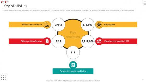 The mentioned slide includes key statistics associated with company working. It includes key statistics such as business revenue, profit before tax, number of production plants, vehicles produced, and employee base.Welcome to our selection of the Key Statistics Automobile Development Company Profile CP SS V. These are designed to help you showcase your creativity and bring your sphere to life. Planning and Innovation are essential for any business that is just starting out. This collection contains the designs that you need for your everyday presentations. All of our PowerPoints are 100 percent editable, so you can customize them to suit your needs. This multi-purpose template can be used in various situations. Grab these presentation templates today. The mentioned slide includes key statistics associated with company working. It includes key statistics such as business revenue, profit before tax, number of production plants, vehicles produced, and employee base.
