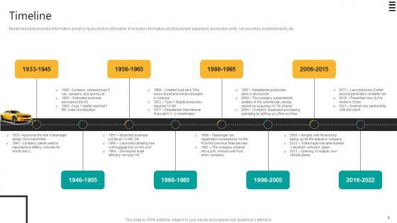 Mentioned slide provides information about company historical timeline. It includes information about business expansion, production units, car launches, establishments, etc.From laying roadmaps to briefing everything in detail, our templates are perfect for you. You can set the stage with your presentation slides. All you have to do is download these easy-to-edit and customizable templates. Timeline Automobile Development Company Profile CP SS V will help you deliver an outstanding performance that everyone would remember and praise you for. Do download this presentation today. Mentioned slide provides information about company historical timeline. It includes information about business expansion, production units, car launches, establishments, etc.