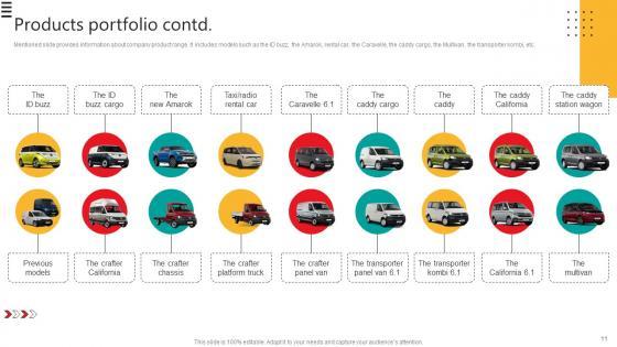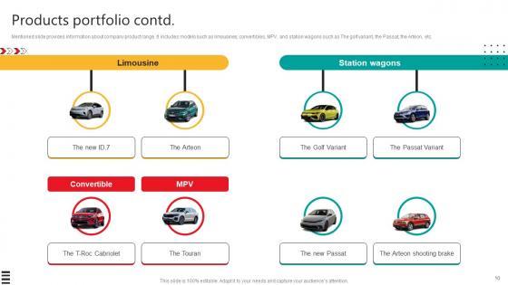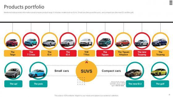 Mentioned slide provides information about company product range. It includes models such as SUVs, Small cars the up and the polo, and compact cars the new ID3 and the golf.Here you can discover an assortment of the finest PowerPoint and Google Slides templates. With these templates, you can create presentations for a variety of purposes while simultaneously providing your audience with an eye-catching visual experience. Download Products Portfolio Automobile Development Company Profile CP SS V to deliver an impeccable presentation. These templates will make your job of preparing presentations much quicker, yet still, maintain a high level of quality. Slidegeeks has experienced researchers who prepare these templates and write high-quality content for you. Later on, you can personalize the content by editing the Products Portfolio Automobile Development Company Profile CP SS V. Mentioned slide provides information about company product range. It includes models such as SUVs, Small cars the up and the polo, and compact cars the new ID3 and the golf.