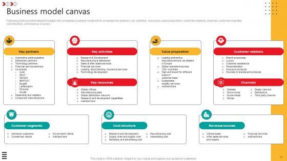 Following slide provided detailed insights into companies business model which comprises key partners, key activities, resources, value proposition, customer relations, channels, customer segment,cost structure, and revenue sources.Slidegeeks is one of the best resources for PowerPoint templates. You can download easily and regulate Business Model Canvas Automobile Development Company Profile CP SS V for your personal presentations from our wonderful collection. A few clicks is all it takes to discover and get the most relevant and appropriate templates. Use our Templates to add a unique zing and appeal to your presentation and meetings. All the slides are easy to edit and you can use them even for advertisement purposes. Following slide provided detailed insights into companies business model which comprises key partners, key activities, resources, value proposition, customer relations, channels, customer segment,cost structure, and revenue sources.