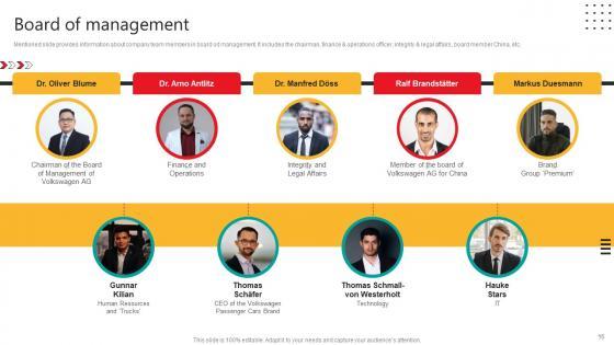 Mentioned slide provides information about company team members in board od management. It includes the chairman, finance and operations officer, integrity and legal affairs, board member China, etc.Boost your pitch with our creative Board Of Management Automobile Development Company Profile CP SS V. Deliver an awe-inspiring pitch that will mesmerize everyone. Using these presentation templates you will surely catch everyones attention. You can browse the ppts collection on our website. We have researchers who are experts at creating the right content for the templates. So you do not have to invest time in any additional work. Just grab the template now and use them. Mentioned slide provides information about company team members in board od management. It includes the chairman, finance and operations officer, integrity and legal affairs, board member China, etc.