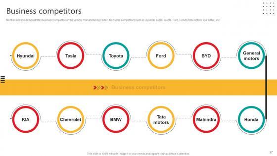 Mentioned slide demonstrates business competitors in the vehicle manufacturing sector. It includes competitors such as Hyundai, Tesla, Toyota, Ford, Honda, tata motors, Kia, BMW, etc.Create an editable Business Competitors Automobile Development Company Profile CP SS V that communicates your idea and engages your audience. Whether you are presenting a business or an educational presentation, pre-designed presentation templates help save time. Business Competitors Automobile Development Company Profile CP SS V is highly customizable and very easy to edit, covering many different styles from creative to business presentations. Slidegeeks has creative team members who have crafted amazing templates. So, go and get them without any delay. Mentioned slide demonstrates business competitors in the vehicle manufacturing sector. It includes competitors such as Hyundai, Tesla, Toyota, Ford, Honda, tata motors, Kia, BMW, etc.