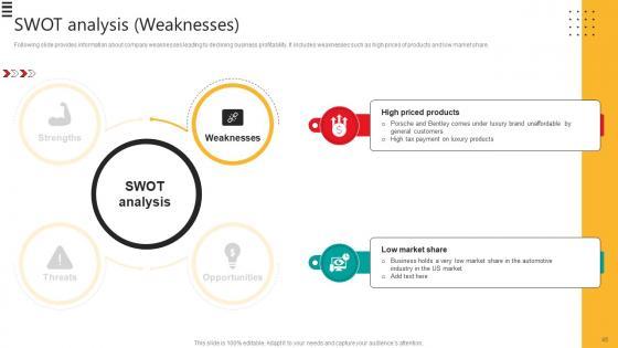Following slide provides information about company weaknesses leading to declining business profitability. It includes weaknesses such as high prices of products and low market share.Do you have to make sure that everyone on your team knows about any specific topic I yes, then you should give Swot Analysis Weaknesses Automobile Development Company Profile CP SS V a try. Our experts have put a lot of knowledge and effort into creating this impeccable Swot Analysis Weaknesses Automobile Development Company Profile CP SS V. You can use this template for your upcoming presentations, as the slides are perfect to represent even the tiniest detail. You can download these templates from the Slidegeeks website and these are easy to edit. So grab these today Following slide provides information about company weaknesses leading to declining business profitability. It includes weaknesses such as high prices of products and low market share.