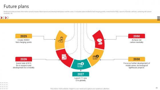 Mentioned slide provides information about company future launch and development plans over the years. It includes plans related to fast charging points, investment in RandD, launch of Electric vehicles, achieving net carbon neutrality, etc.Crafting an eye-catching presentation has never been more straightforward. Let your presentation shine with this tasteful yet straightforward Future Plans Automobile Development Company Profile CP SS V template. It offers a minimalistic and classy look that is great for making a statement. The colors have been employed intelligently to add a bit of playfulness while still remaining professional. Construct the ideal Future Plans Automobile Development Company Profile CP SS V that effortlessly grabs the attention of your audience Begin now and be certain to wow your customers Mentioned slide provides information about company future launch and development plans over the years. It includes plans related to fast charging points, investment in RandD, launch of Electric vehicles, achieving net carbon neutrality, etc.