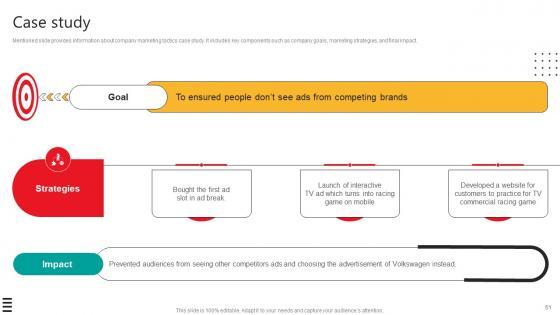 Mentioned slide provides information about company marketing tactics case study. It includes key components such as company goals, marketing strategies, and final impact.Want to ace your presentation in front of a live audience Our Case Study Automobile Development Company Profile CP SS V can help you do that by engaging all the users towards you. Slidegeeks experts have put their efforts and expertise into creating these impeccable powerpoint presentations so that you can communicate your ideas clearly. Moreover, all the templates are customizable, and easy-to-edit and downloadable. Use these for both personal and commercial use. Mentioned slide provides information about company marketing tactics case study. It includes key components such as company goals, marketing strategies, and final impact.