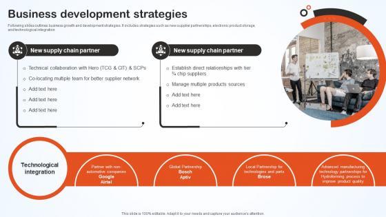 Following slides outlines business growth and development strategies. It includes strategies such as new supplier partnerships, electronic product storage, and technological integration. Boost your pitch with our creative Business Development Strategies Hero Bike Company Profile CP SS V. Deliver an awe-inspiring pitch that will mesmerize everyone. Using these presentation templates you will surely catch everyones attention. You can browse the ppts collection on our website. We have researchers who are experts at creating the right content for the templates. So you do not have to invest time in any additional work. Just grab the template now and use them. Following slides outlines business growth and development strategies. It includes strategies such as new supplier partnerships, electronic product storage, and technological integration.