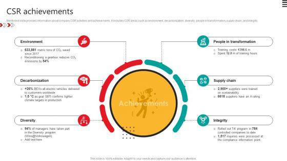 Mentioned slide provides information about company CSR activities and achievements. It includes CSR areas such as environment, decarbonization, diversity, people in transformation, supply chain, and integrity. From laying roadmaps to briefing everything in detail, our templates are perfect for you. You can set the stage with your presentation slides. All you have to do is download these easy-to-edit and customizable templates. CSR Achievements Automobile Development Company Profile CP SS V will help you deliver an outstanding performance that everyone would remember and praise you for. Do download this presentation today. Mentioned slide provides information about company CSR activities and achievements. It includes CSR areas such as environment, decarbonization, diversity, people in transformation, supply chain, and integrity.